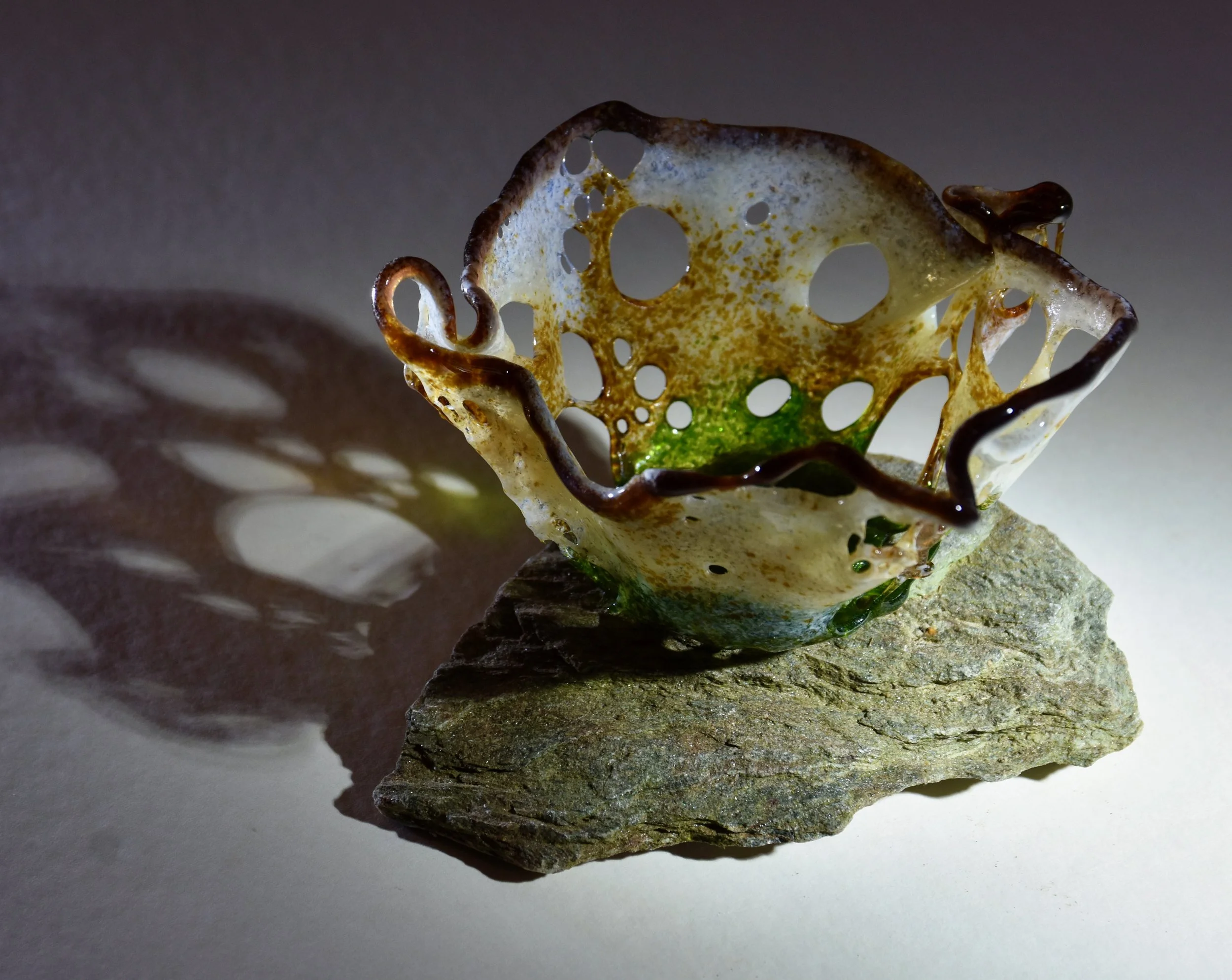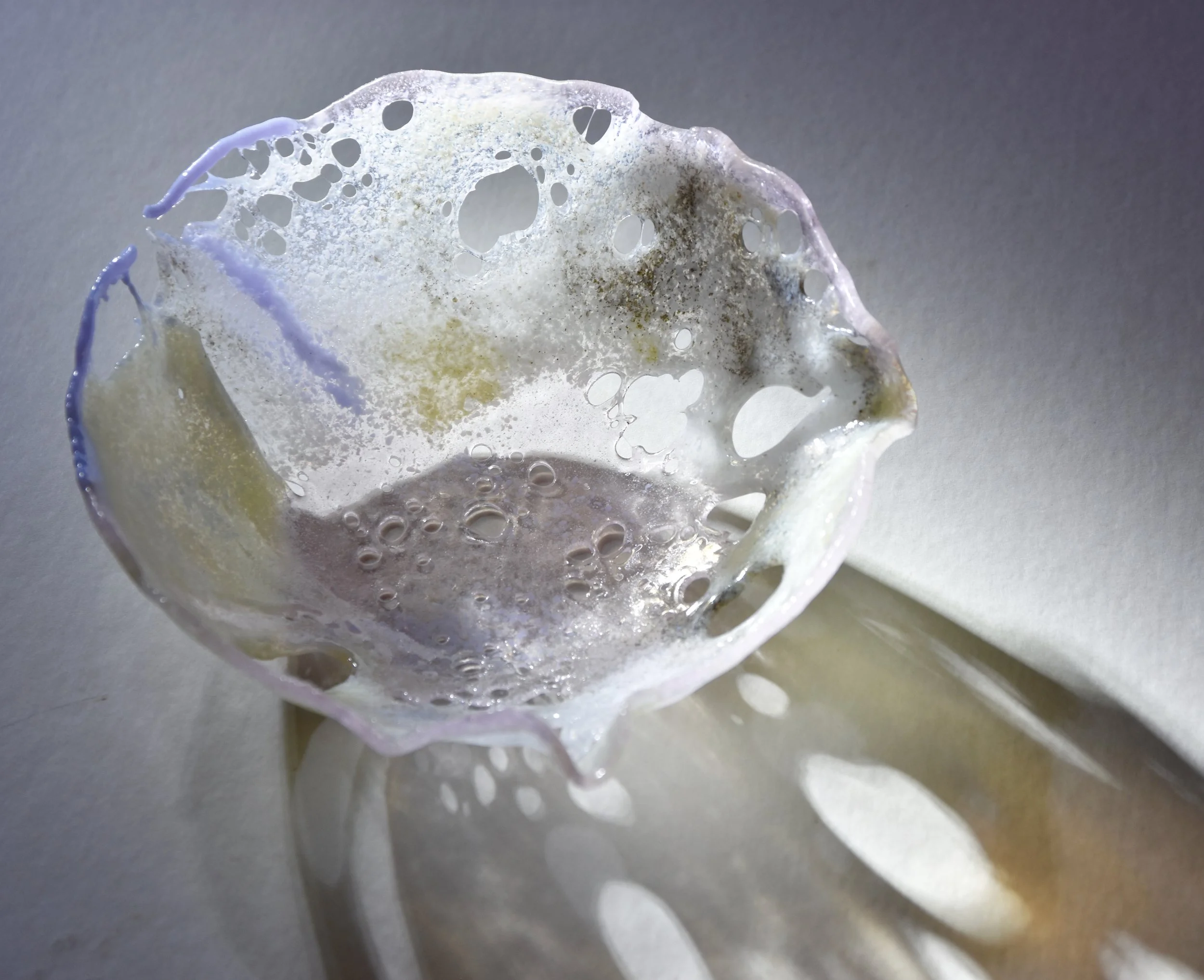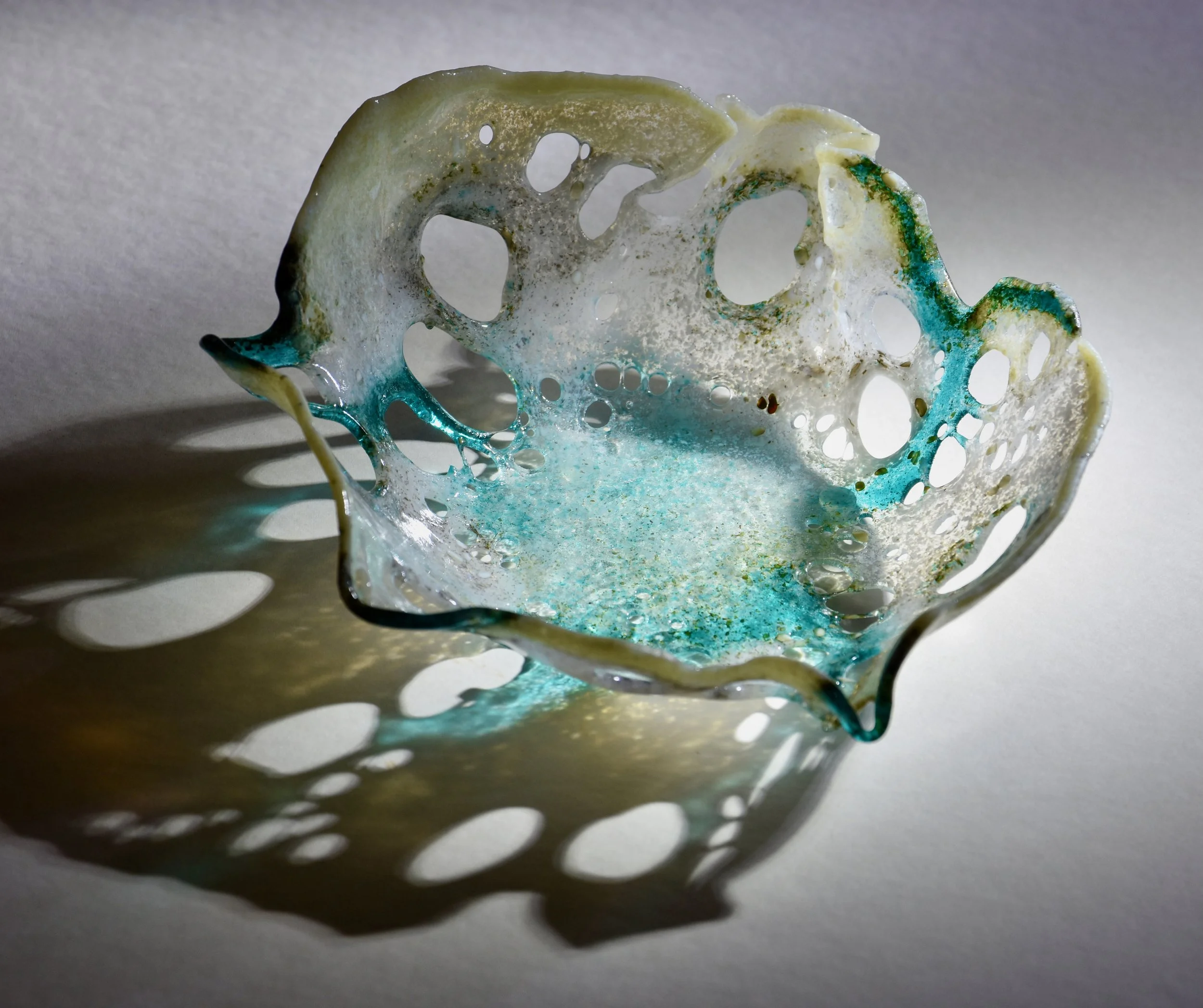 I work on thin fire paper “drawing” with combinations of smashed glass, frit, paint and silver leaf without base glass. This is then kiln fired to fuse and stretch the glass to the maximum allowing holes to form, these holes can look beautiful but they illustrate that when we overuse the world’s resources things can just get stretched too thin.