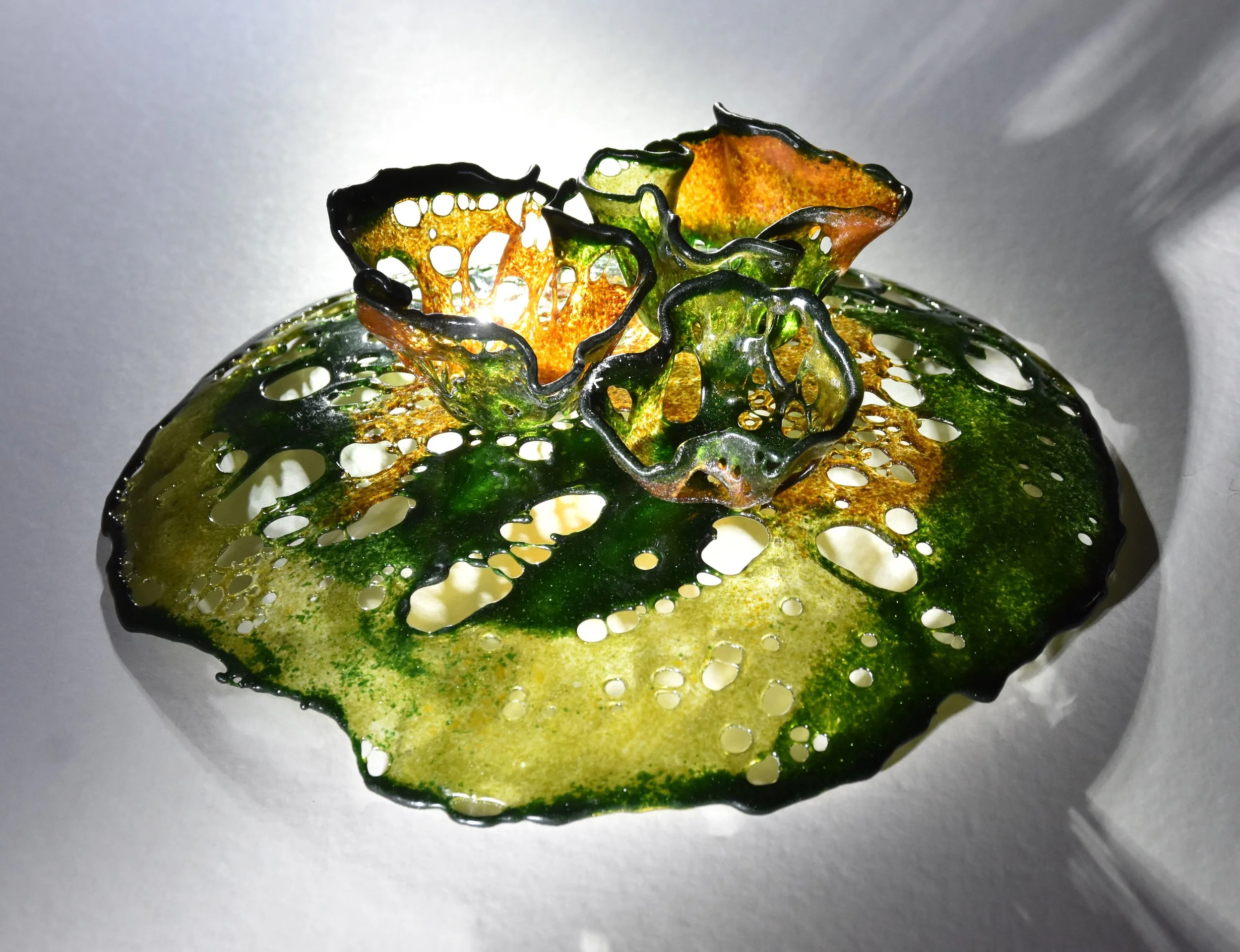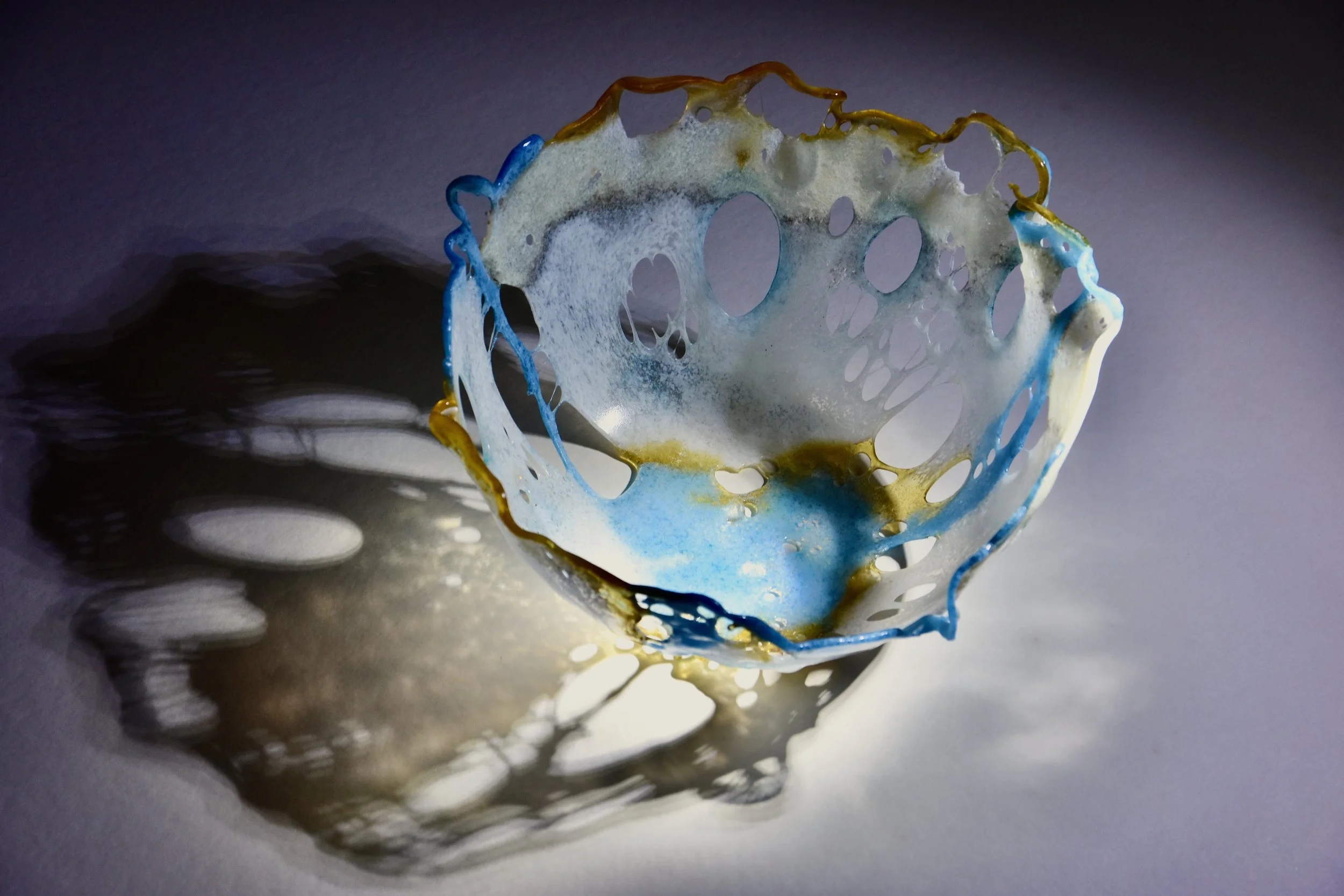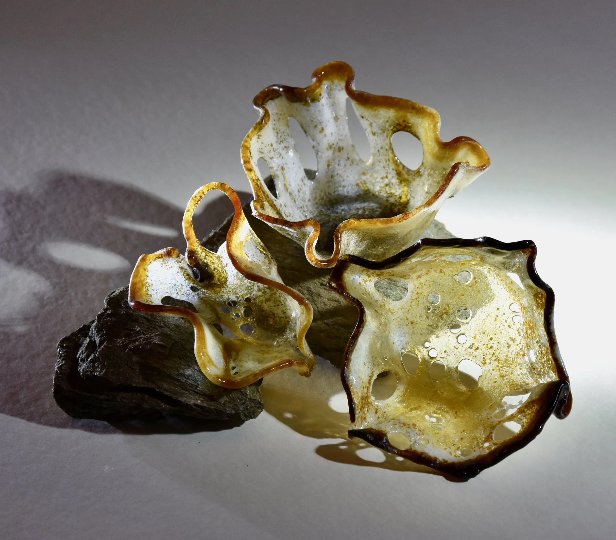 I work on thin fire paper “drawing” with combinations of smashed glass, frit, paint and silver leaf without base glass. This is then kiln fired to fuse and stretch the glass to the maximum allowing holes to form, these holes can look beautiful but they illustrate that when we overuse the world’s resources things can just get stretched too thin.